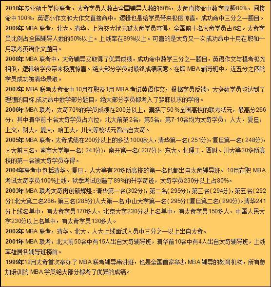 太奇會及時將各種有關MBA聯考的最新信息(大綱、復習資料、教材、報名、考試動態(tài)、聯考、考分查詢、調劑、面試等)通過課堂、編印內部資料、太奇網站及中國MBA網傳送給學員。