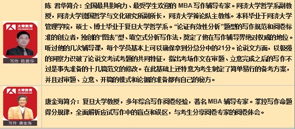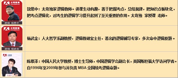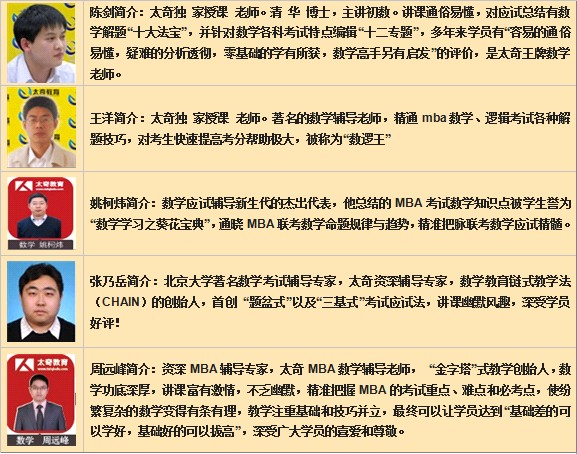 太奇不計成本的狠抓師資質量,薈萃了北京乃至全國的最強師資陣容,他們從事MBA教學多年,有著豐富的教學經驗,有的曾多年參與命題,有的是閱卷組負責人,經驗豐富,輔導卓有成效,眾所公認:太奇師資最強,是經過實踐檢驗的名師陣容。
