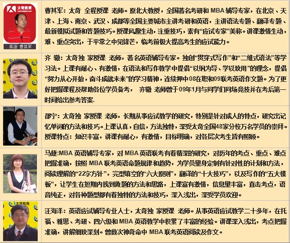 太奇在MBA輔導領域首屈一指的地位,是無數考生在實踐檢驗中選擇的結果,優(yōu)秀的學員選擇了優(yōu)秀的太奇,太奇的成功首先源于學員的成功,口碑是最好的廣告。正如太奇往屆學員所說:“太奇如此高的命中率和上線率,使不上太奇成為一種冒險”!太奇2011年MBA聯考輔導,將總結以往成功經驗,進一步優(yōu)化師資,加強服務,數學輔導新生代領袖陳劍、姚科偉、王洋、張乃岳,著名的英語輔導專 家曹其軍 老師、 邵寧 老師、 齊轍 老師、 馬捷 老師,著名邏輯輔導專家饒思中均為我校獨家全程主講;太奇承諾為每一位學員提供入學診斷,建立學習檔案,制訂個性化復習計劃,助教全程追蹤服務。同時還將通過太奇俱樂部和中國MBA網提供交流、交友、招聘、求職、創(chuàng)業(yè)、融資等增值服務.